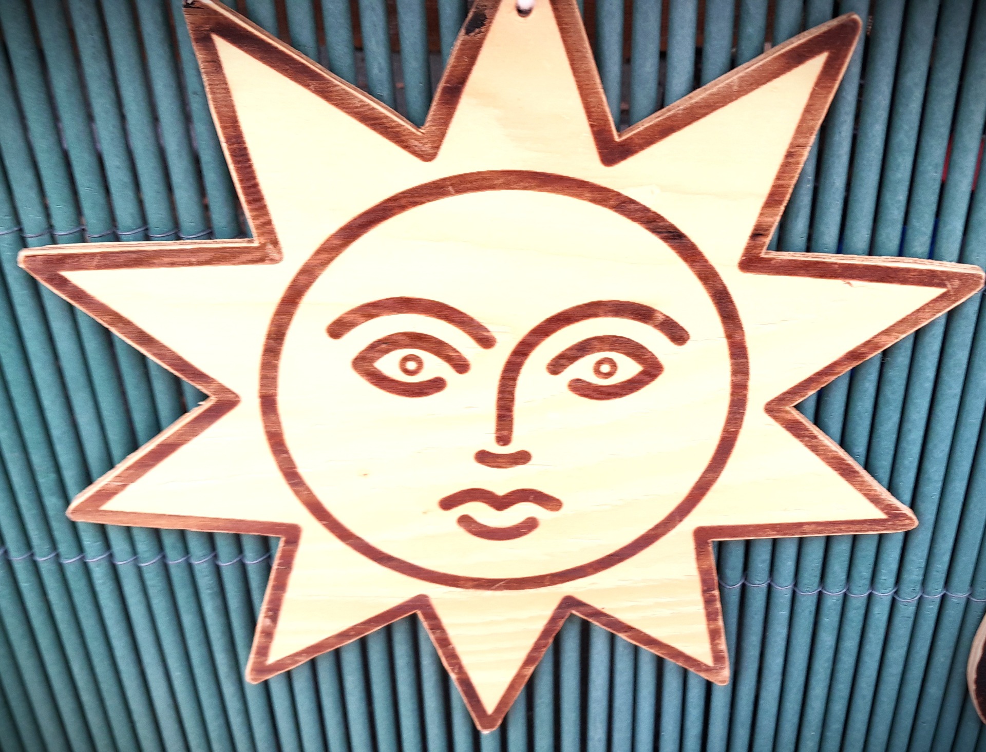 Dekorace na dveře, na zavěšení-SLUNCE-29cm průměr. Gravírované, natřeno bezbarvým lakem, provázek na zavěšení. Materiál- překližka 0,6cm.