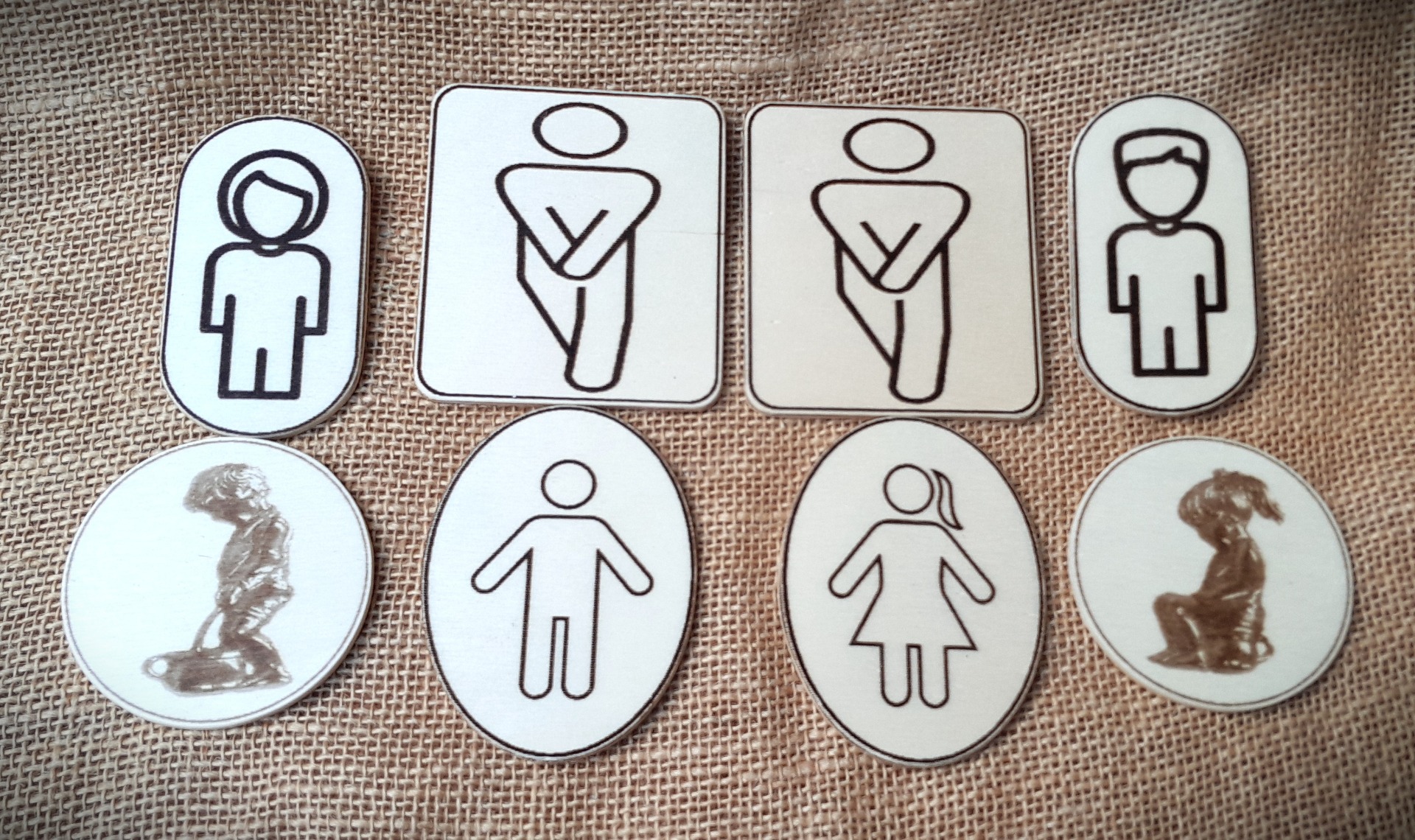 Označení WC, gravírované, různé, stačí vybrat. Velikost cca 8 - 10 cm. Ošetřeno bezbarvým lakem. Cena za 1 ks.